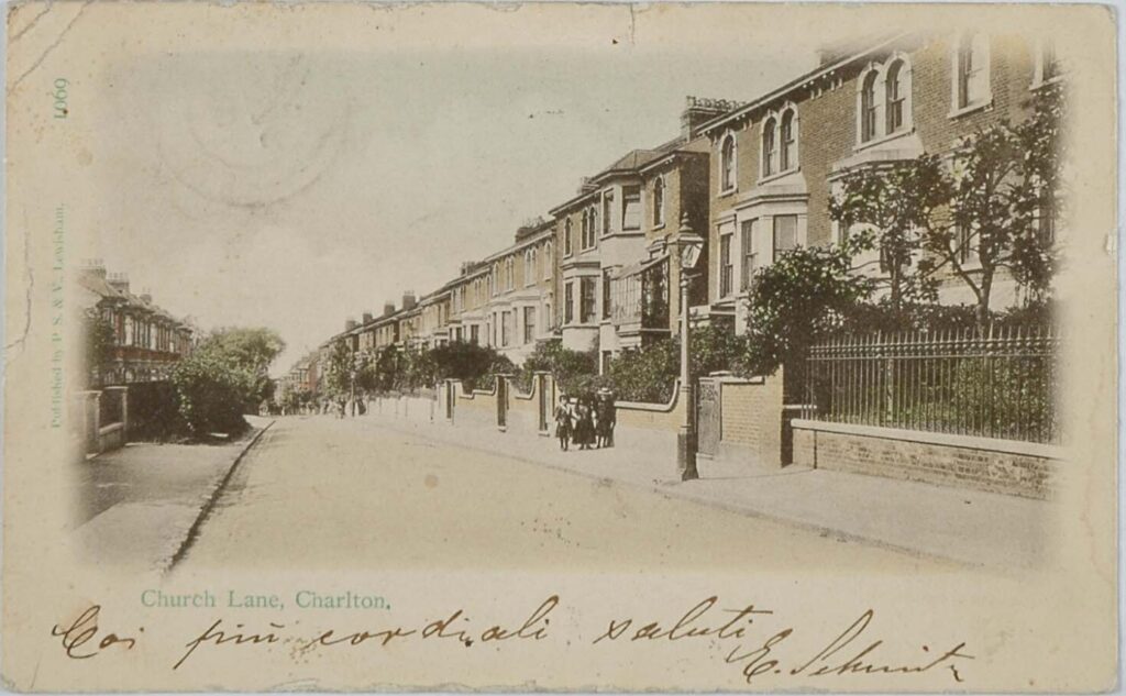 Manoscritto a inchiostro nero, con annotazioni a lapis di Ario Tribel[14]. Cartolina postale di dimensioni 90 x 140 mm, scritta al recto nel bordo inferiore sotto la foto, senza data. Spedita da Charlton il 26 ottobre 1905 al «Signor | Ario Tribel | presso il signor | Gioachino Veneziani | Trieste | Austria». La data topica e quella cronologica sono ricavate dal timbro postale. Sul recto una foto di Church Lane a Charlton.