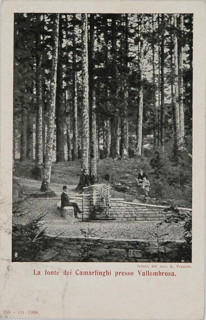 Manoscritto a inchiostro nero, con annotazioni a lapis di Ario Tribel[16]. Cartolina illustrata di dimensioni 140 x 90 mm, scritta solo al verso, senza data. Spedita da Vallombrosa il 5 agosto 1909 «Al Signor | Ario Tribel | presso il sig. Gioachino | Veneziani | Trieste». La data topica e quella cronologica sono ricavate dal timbro postale. Sul recto una foto della «Fonte dei Camarlinghi presso Vallombrosa».