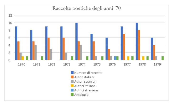 Si può notare dal grafico una sostanziale omogeneità nel numero di pubblicazioni, con una depressione tra il ’75 e il ’76 e successivamente nel ’79, ma una piattezza e una monotonia di nomi ben distanti dal decennio precedente: mancano completamente gli esordienti e vengono pubblicate solamente due autrici italiane e un’autrice straniera, tutte già note. Si noti, inoltre, il disinteresse generale per la poesia internazionale soprattutto dalla seconda metà degli anni ’70. I tempi dello sperimentalismo e dei laboratori sembrano essere finiti e la nuova politica mondadoriana, che vuole assicurarsi delle buone vendite e punta su titoli e nomi “sicuri”, è perfettamente riflessa in questo grafico. In tutto in questo decennio si pubblicano 83 opere poetiche.