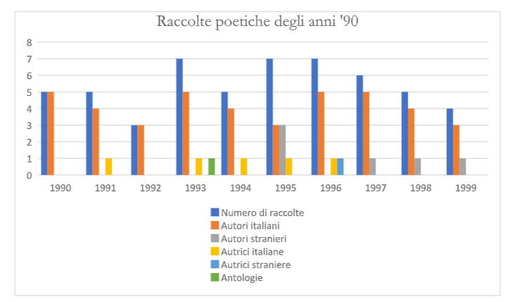 Si torna, dunque, a un numero complessivo di poco superiore alle 50 unità e la presenza di una sola antologia che corrisponde all’Almanacco. C’è una maggior presenza di donne tra gli autori, e un minimo di interesse in più per la poesia straniera (sebbene i nomi si ripetano a oltranza). Siamo lontani, ormai, dagli anni in cui investire sulla poesia dava prestigio al nome di una casa editrice. Anzi, più si avanza nel tempo più sembra che quasi ci si vergogni a fare dello sperimentalismo. Una lieve ricrescita dei titoli si ha dal ’93 in poi (anche in virtù delle nuove avanguardie), ma i 78 titoli che Sereni è riuscito a lanciare in meno di un decennio sembrano un lontano miraggio.